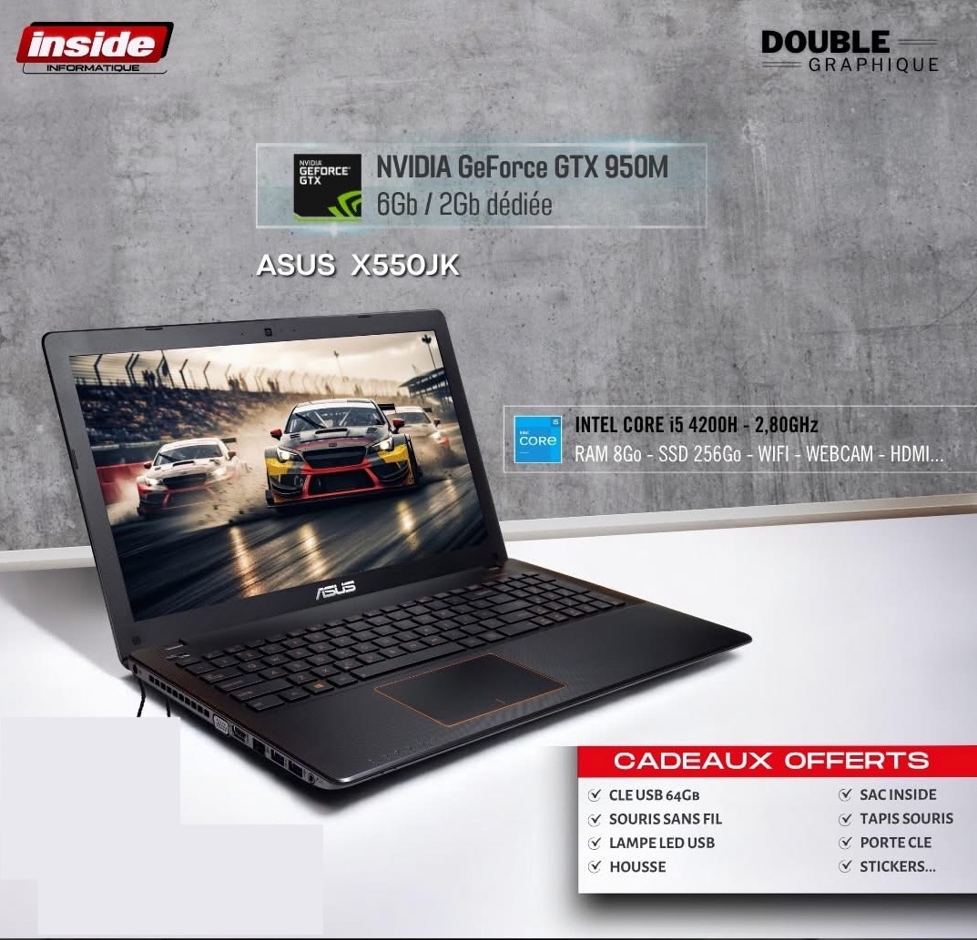 ASUS X550JK (15,6") Slim – PC portable performant avec processeur Intel i5-4200H, 8 Go de RAM, SSD 240 Go et double carte graphique (Intel HD 4600 + Nvidia GTX 950M 2 Go). Équipé du WiFi, Bluetooth, Webcam, HDMI, VGA et USB 3.0, dans un format slim.