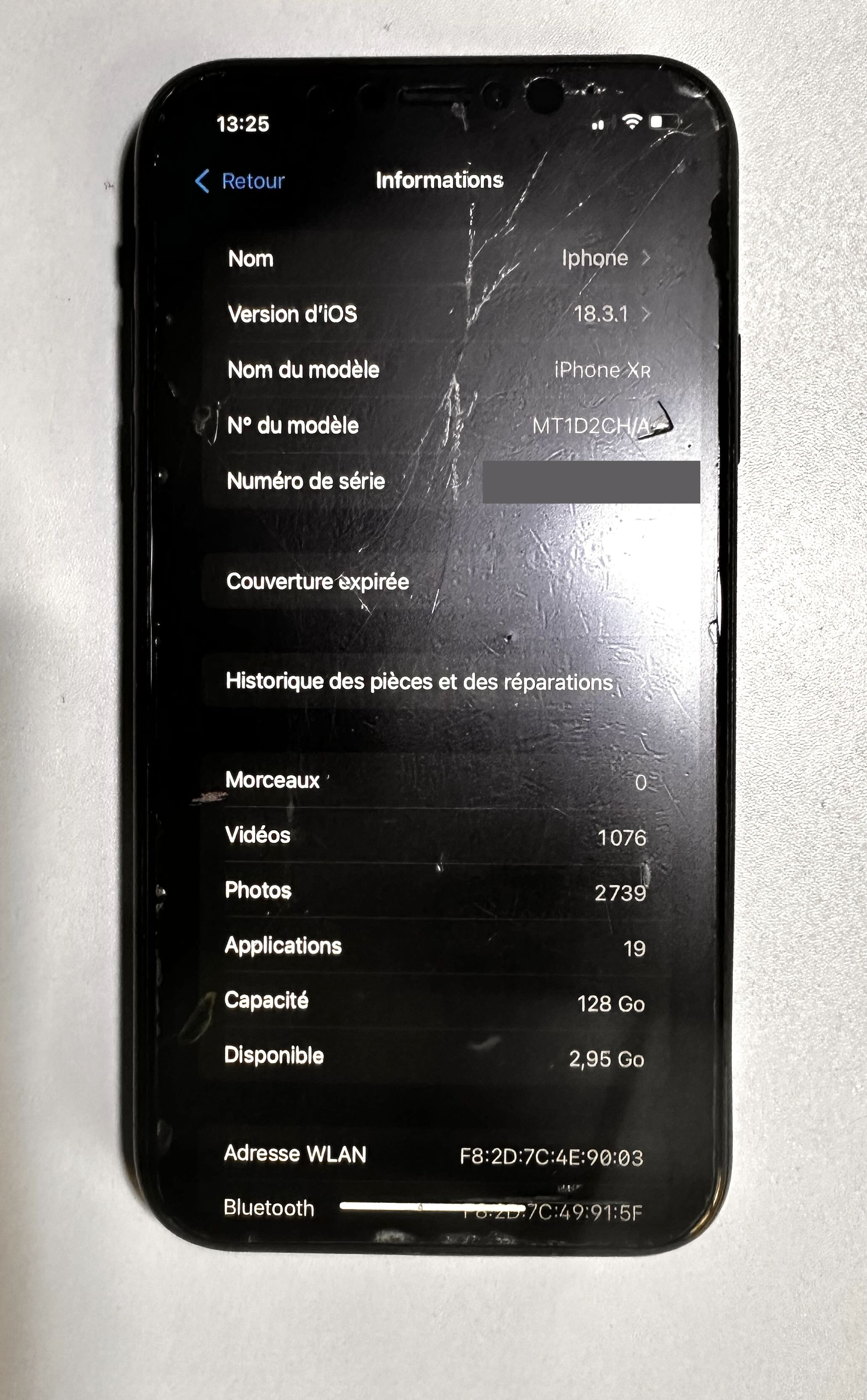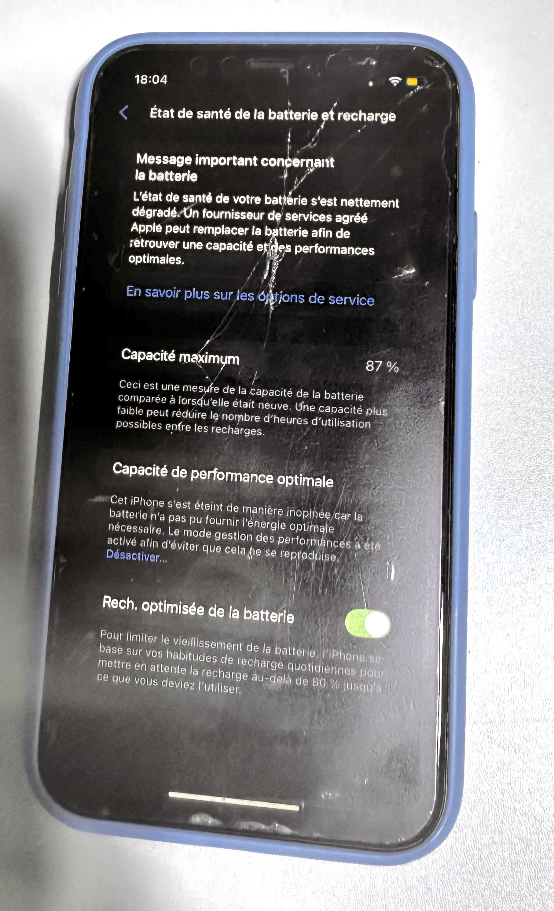iPhone XR de 128 Go en très bon état de fonctionnement, avec batterie à 87%.