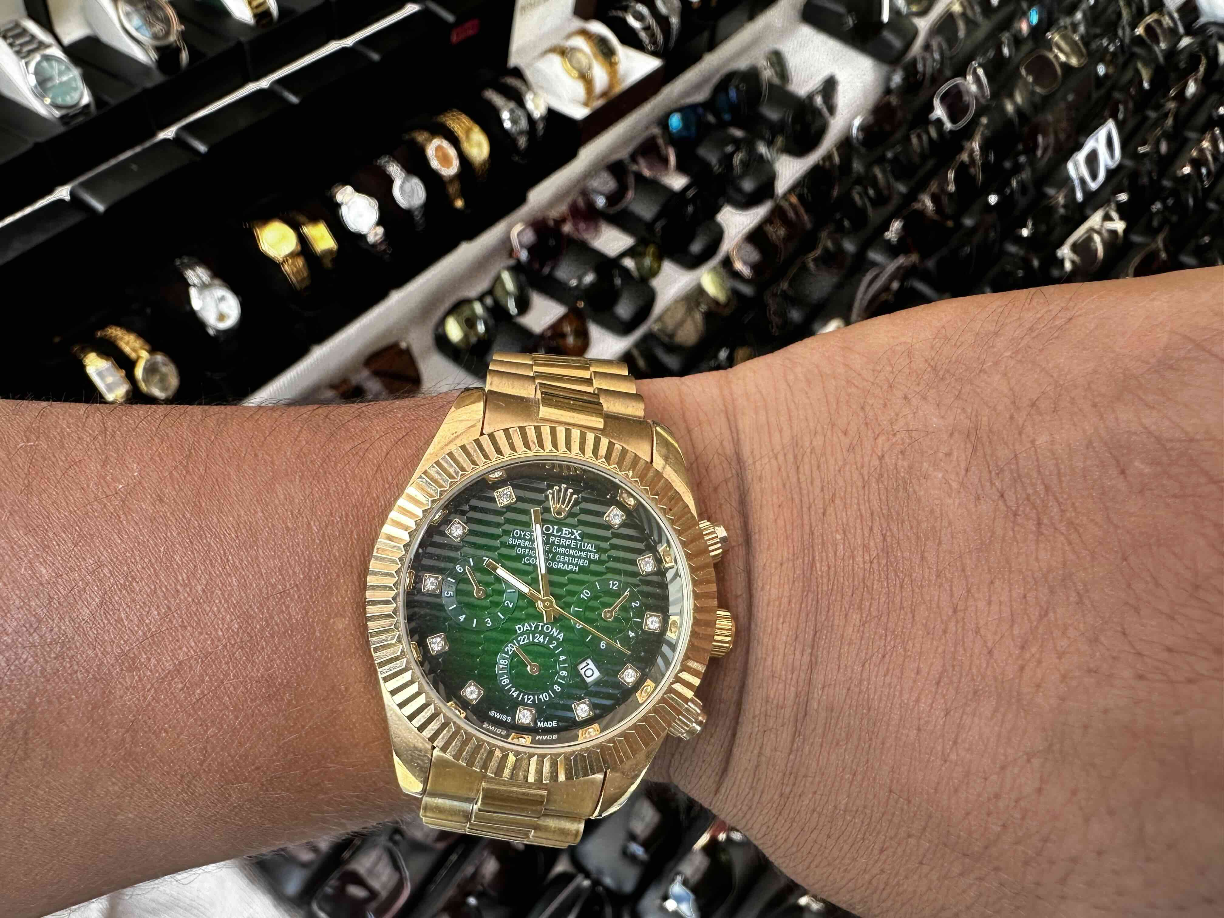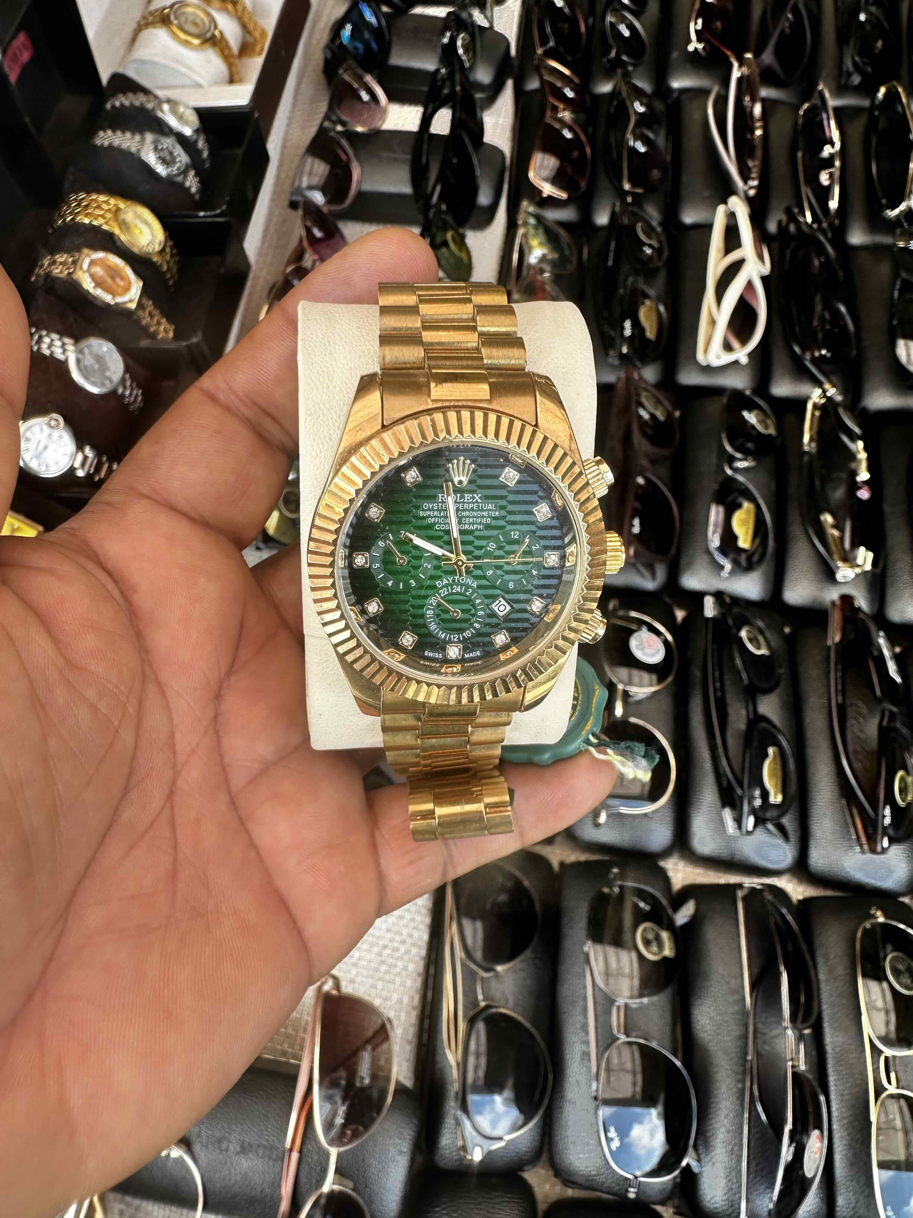 Élégante montre Rolex fabriquée en Suisse, modèle d’origine avec intérieur vert distinctif et monture plaquée or. Pièce d’occasion en très bon état, alliant prestige, précision suisse et style intemporel. Parfaite pour un look raffiné et luxueux.