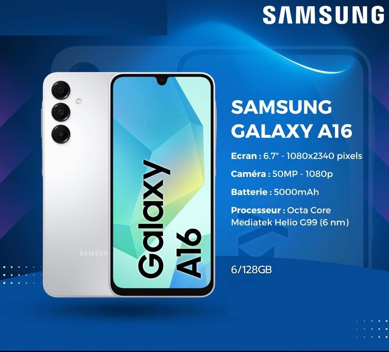 Le Samsung Galaxy A16 offre une expérience fluide et immersive grâce à son grand écran 6,7 pouces Full HD+ (1080×2340), idéal pour les vidéos, les jeux et la navigation quotidienne.
